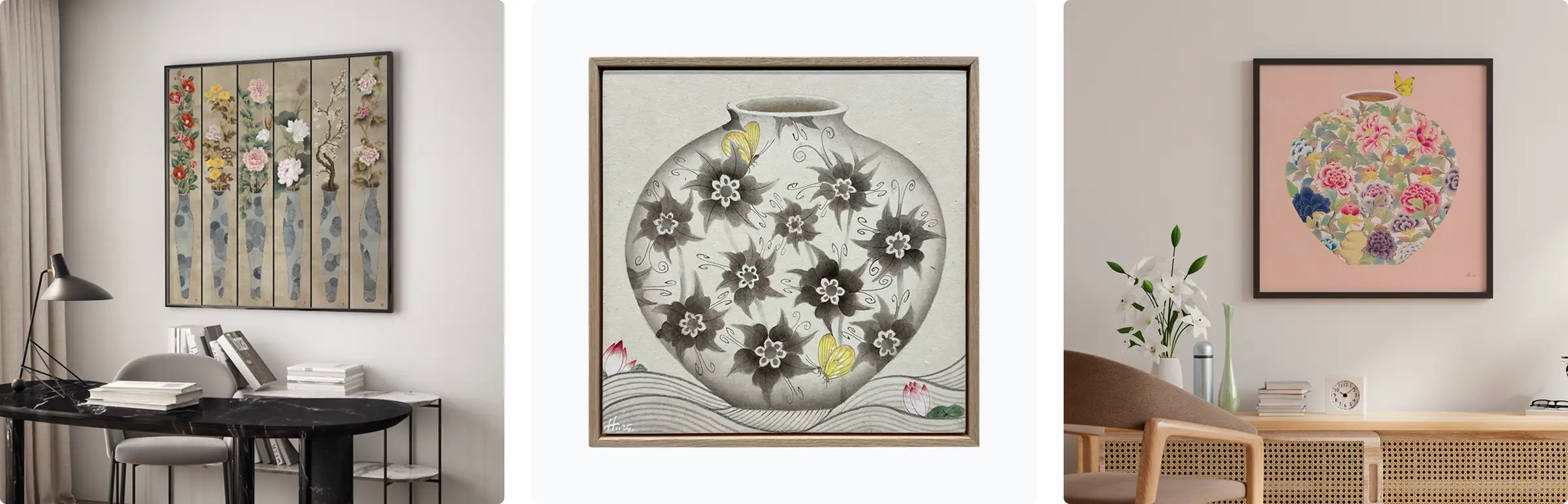 왼쪽부터 바램 6폭 (Vase of Happiness), 달항아리 Wave 꽃, 달항아리_화원 華園