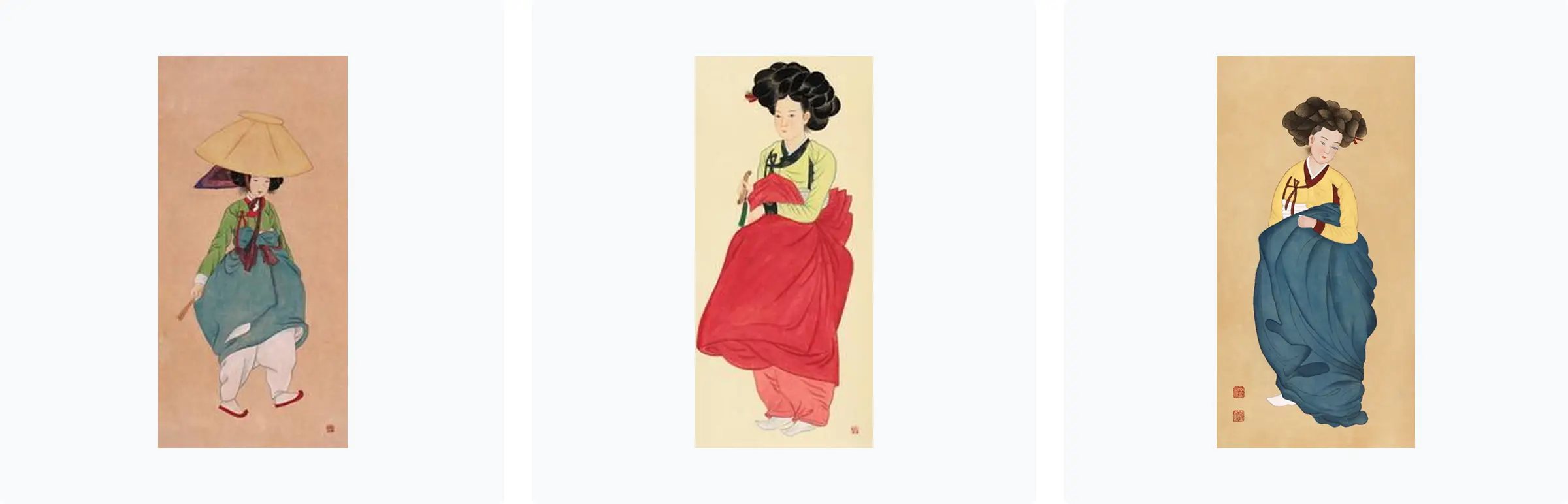 왼쪽부터 신윤복 미인도 (전모를 쓴 여인), 채용신 팔도미인도 8곡병 (평양미인), 미인도
