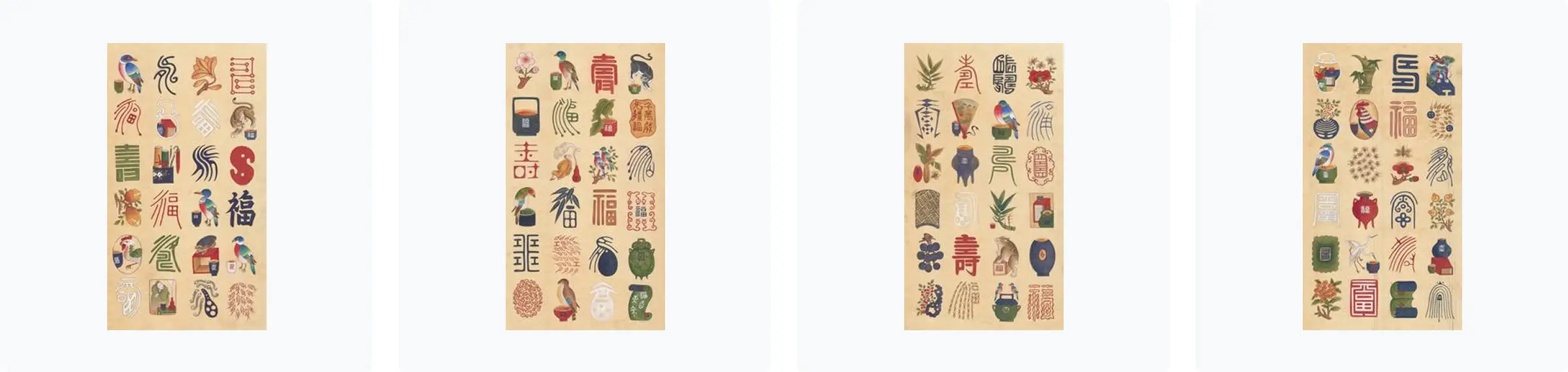 왼쪽부터 백수백복도 8폭 I, 백수백복도 8폭 II, 백수백복도 8폭 III, 백수백복도 8폭 Ⅴ